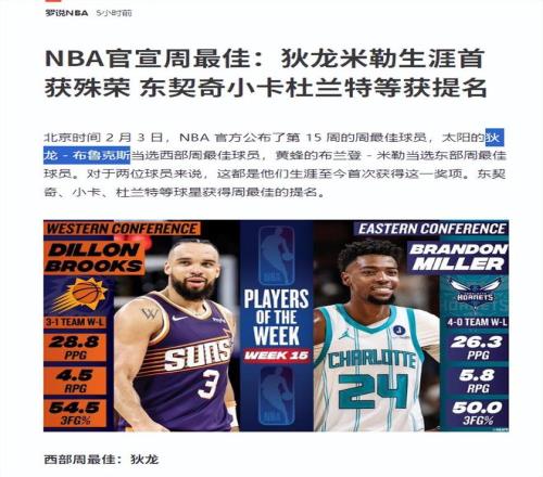 太陽隊的狄龍成功當選西部的周最佳球員,而東部的最佳球員則被黃蜂的米勒收入囊中。