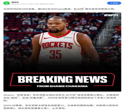 本屬于太陽隊的“死神”杜蘭特被交易至西部火箭隊,而火箭隊給出的誘人條件讓人不解。