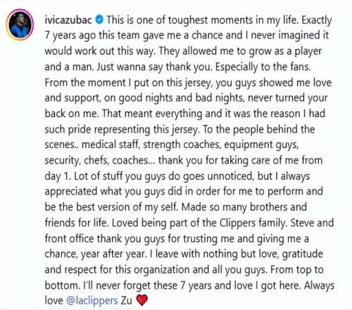 此刻離別,我心中唯有對這支球隊、對所有人的愛、感激與敬意,從上到下,無一例外。我永遠不會忘記這七年的時光,不會忘記在這里收獲的所有愛。永遠愛你們@洛杉磯快船隊