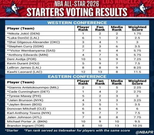 東契奇(斯洛文尼亞人)球迷投票高居第一,球員投票排名第六,媒體投票位列第二(權重為2.5)。