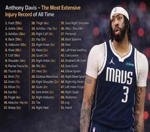 事實上,傷病一直是都是濃眉職業生涯揮之不去的陰影。這位32歲球星的傷病史足以列出一份長長的名單。從早期的肩部、膝蓋問題到近年的腳踝、腹股溝和手部傷病,累計至少遭遇285次傷病,可謂是觸目驚心。