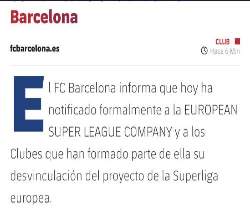 北京時間2月7日晚,西甲豪門巴塞羅那俱樂部官方發布聲明:已向歐洲超級聯賽公司及其參與組建俱樂部告知,即日起正式退出歐洲超級聯賽項目。