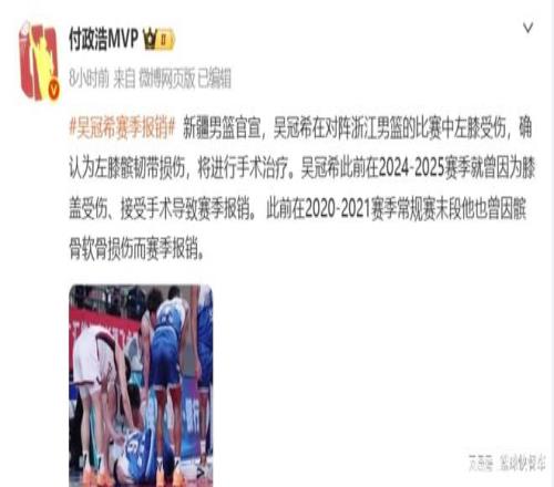 CBA聯賽又傳來一大悲劇。目前,CBA季中杯正如火如荼進行中,不過,對于新疆男籃而言,他們卻遭遇一大打擊。球隊主力中鋒吳冠希將因傷直接錯過本賽季,也就是我們俗稱的賽季報銷。自從2021年髕骨軟骨損傷賽季報銷后,在過去5年里,他已經先后4次賽季報銷,成為CBA聯盟中不折不扣的玻璃人。很顯然,吳冠希的意外受傷,無論是對于新疆隊,還是對于他本人,都是一個晴天霹靂。