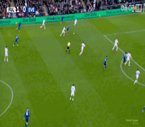 第75分鐘,霍爾中路搶點(diǎn),低射扳平比分,富勒姆1-1埃弗頓