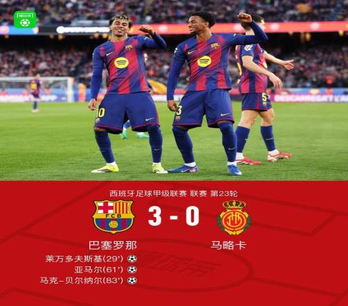 北京時(shí)間2月7日西班牙足球甲級(jí)聯(lián)賽 聯(lián)賽 第23輪,巴塞羅那主場(chǎng)對(duì)陣馬略卡。上半場(chǎng)禁區(qū)內(nèi)球反彈到奧爾莫腿上,萊萬調(diào)整后破門。下半場(chǎng)奧爾莫傳球,亞馬爾轟出一記世界波,之后貝爾納爾突入禁區(qū)冷靜扣過防守后折射破門斬獲巴薩一線隊(duì)首球。最終巴薩3-0戰(zhàn)勝馬略卡。