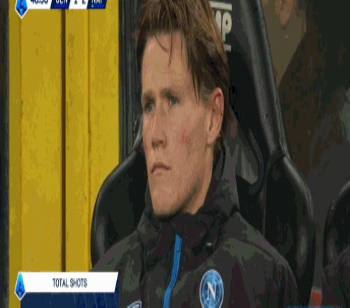 第20分鐘,兩位曼聯(lián)棄將聯(lián)手為那不勒斯扳平比分。麥克托米奈勁射被撲出,霍伊倫補(bǔ)射建功,場(chǎng)上比分變?yōu)?-1。