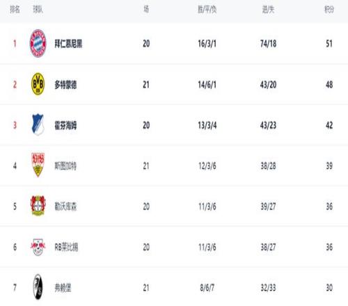 在積分榜上,拜仁依然占據(jù)榜首位置,16勝3平1負(fù),拿到51分。而多特蒙德不斷贏球之后,總積分已經(jīng)達(dá)到48分,只落后拜仁3分。不過,多特蒙德比拜仁多踢1場(chǎng)。霍芬海姆以42分排名第3。第4的是斯圖加特,拿到了39分。勒沃庫(kù)森以36分排名第5。萊比錫也是36分,排名第6。勒沃庫(kù)森和萊比錫與歐冠區(qū)的差距都只有3分。弗賴堡拿到30分,排第7。