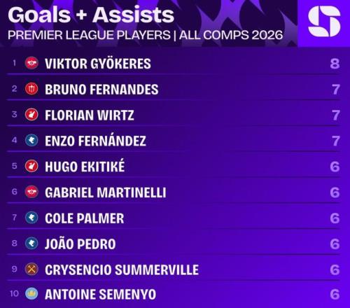 2026賽季英超球員所有賽事進球+助攻榜(前十)