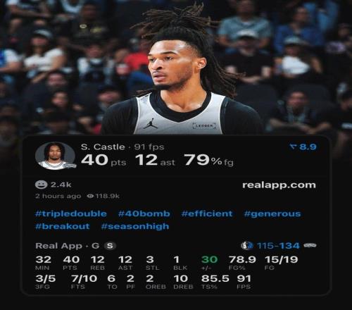 全場卡斯爾出戰31分51秒,19中15,三分5中3,爆砍生涯新高的40分,外加12板12助3搶斷1蓋帽超級大三雙。