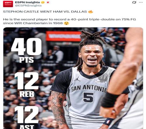 狂轟40分12板12助超級大三雙,4號秀卡斯爾牛馬大戰刷爆紀錄搶戲文班!馬刺隊4大新星齊暴走天賦溢出。