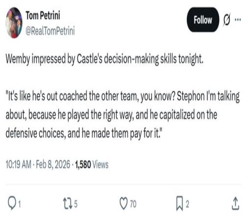 卡斯爾在打出生涯之夜后則感謝了球迷的支持:“能夠擁有這座城市與球迷的愛,讓我登場打球都會美好的有些不真實感,尤其是在職業生涯還很年輕的時候,真的是太特別了。”