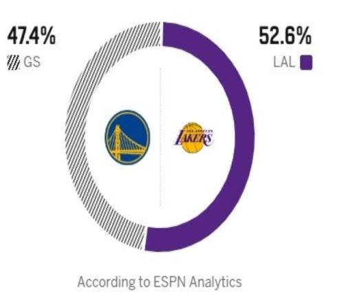 北京時間2月8日,NBA常規賽迎來湖人與勇士的豪門對決,遺憾的是,勇士這邊巴特勒賽季報銷,庫里和新援波爾津吉斯因傷缺陣,而湖人這邊也少了東契奇與艾頓,這也讓這場比賽少了不少看點。本賽季雖然勇士遭遇嚴重的傷病,但是他們在外線的投籃總能給人驚喜,也總有奇兵站出來幫助球隊爆冷拿下勝利,上一場比賽,勇士就擊敗了太陽,目前以28勝24負的戰績位列西部第八。反觀湖人這邊近期拿到二連勝,以31勝19負的戰績位列西部第五。雖然東契奇缺陣,但是里夫斯回歸后就打出驚艷的表現,上場對陣76人狂砍35分,聯手詹姆斯帶隊拿到勝利。本場比賽,考慮到勇士客場作戰加上隊內三大得分手都打不了,湖人拿到勝利的概率很大。ESPN數據賽前預測,湖人拿下勝利的概率為52.6%。