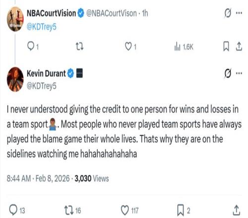 除此之外,杜蘭特還回?fù)袅诉B續(xù)三個(gè)賽季該為球隊(duì)失敗擔(dān)責(zé)的言論,坦言籃球是一項(xiàng)團(tuán)隊(duì)運(yùn)動(dòng),不能將勝利和失敗的功勞或責(zé)任歸于一個(gè)人,很多人從未參與過團(tuán)隊(duì)運(yùn)動(dòng),只是癡迷于相互指責(zé)。