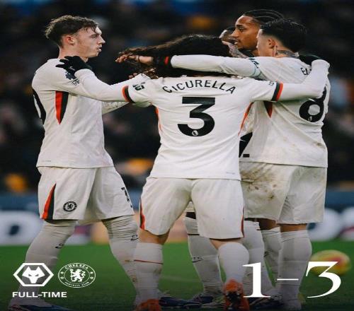 切爾西客場3-1擊敗墊底的狼隊后,藍軍豪取聯賽四連勝,在積分榜上進一步縮小與前四的差距,只比第四的曼聯少1分。狼隊繼續深陷降級泥潭,保級形勢愈發嚴峻。這場比賽的勝負懸念在上半場便基本揭曉,帕爾默的帽子戲法與若昂·佩德羅的兩次造點,成為藍軍客場奏凱的最大功臣,下半場狼隊雖扳回一球,但難以逆轉敗局,切爾西用一場勝利延續了新帥羅塞尼爾上任后的良好勢頭。