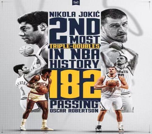 約基奇達成生涯常規賽第182次三雙,正式超越大O奧斯卡-羅伯特森181次三雙獨占歷史第二,僅次于前隊友威少207次三雙。
