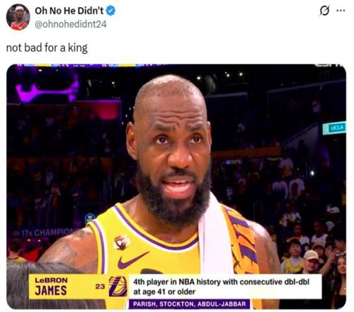 同時也成為NBA歷史上第四位在41歲后還能連續兩場交出兩雙的球員,前三人分別是帕里什、斯托克頓和賈巴爾。