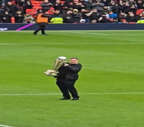 飛鏢世錦賽冠軍利特勒現(xiàn)場(chǎng)觀戰(zhàn),并在中場(chǎng)休息時(shí),當(dāng)著曼聯(lián)球迷的面高舉自己的世錦賽獎(jiǎng)杯展示。