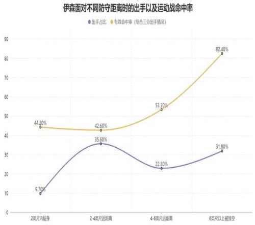 同時(shí),伊森本賽季面對(duì)2英尺內(nèi)的貼身防守時(shí)的出手較少并且有效命中率較低,但隨著對(duì)手的防守距離越遠(yuǎn)他的有效命中率也就越高,這意味著雖然他面對(duì)嚴(yán)防時(shí)的攻堅(jiān)硬解能力不足,但只要對(duì)手給他出手空間那么他就有很高效的得分產(chǎn)量以及效率,而面對(duì)6英尺以上被放空時(shí)他的三分球達(dá)到了聯(lián)盟最優(yōu)級(jí)別: