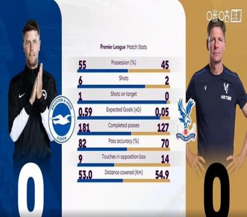 半場結束,兩支球隊暫時戰成0-0平。上半場比賽,兩隊雖然比賽節奏轉換的都比較快,但是雷聲大雨點小,實際并沒有創造出絕佳的破門機會,水晶宮在場面上略處于下風。