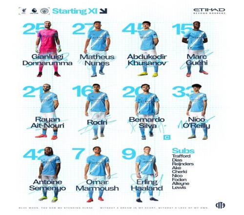 替補:1-特拉福德、3-魯本-迪亞斯、4-賴因德斯、6-阿克、10-謝爾基、14-尼科-岡薩雷斯、47-福登、68-馬克斯-阿萊恩、82-里科-劉易斯