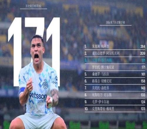 國米隊長勞塔羅此役再度有進球入賬,這是阿根廷前鋒本賽季各項賽事第18球,意甲賽場上第14球,目前繼續領跑射手榜。更重要的是,這粒進球是勞塔羅國米生涯第171球,他正式追平傳奇射手博寧塞尼亞,并列隊史射手榜第三位,排在他身前的只剩梅阿查(284球)和阿爾托貝利(209球)。