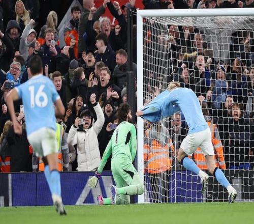 第93分鐘,阿利松送點,哈蘭德點射破門,曼城反超比分。