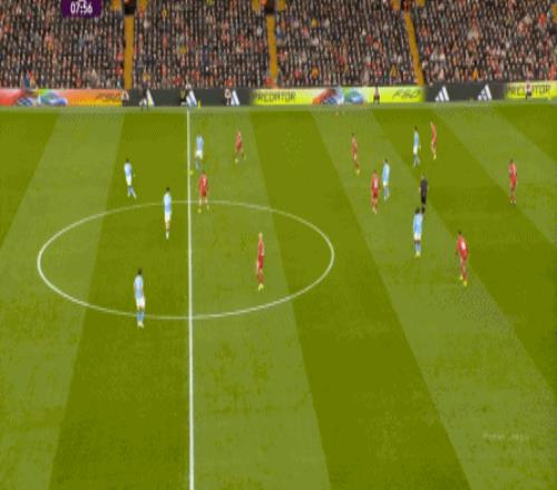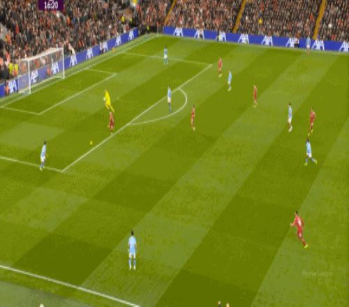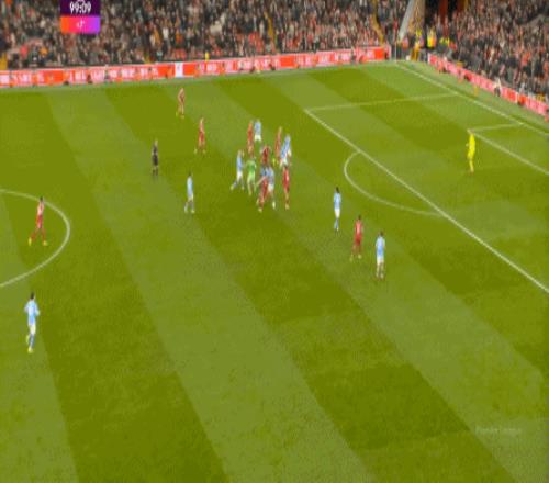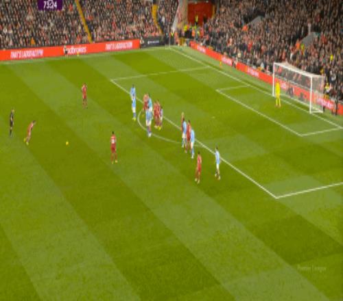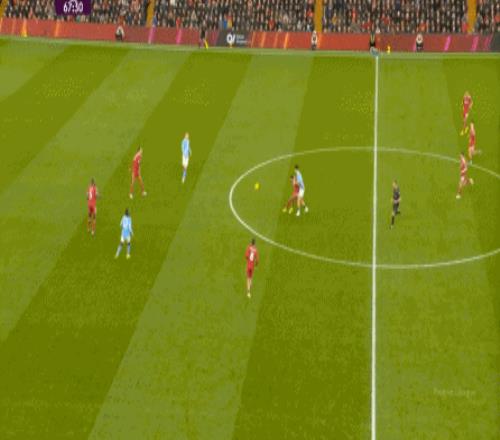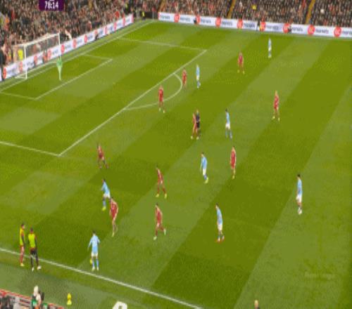 這在戰(zhàn)術(shù)上不會(huì)有特別明顯的變化,所以曼城的表現(xiàn)并未立刻改善,于是在第73分鐘,利物浦在由左至右的轉(zhuǎn)移過程中打出進(jìn)攻,隨后在二點(diǎn)爭(zhēng)奪中制造了定位球: