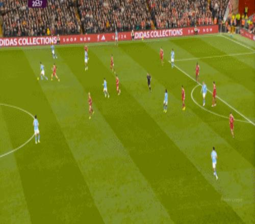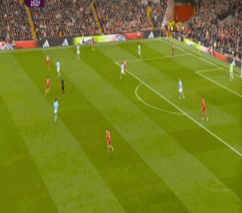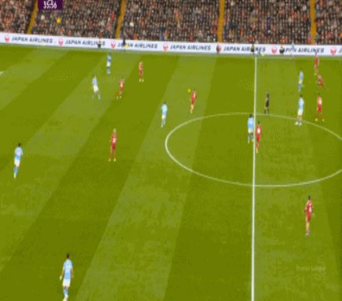 當(dāng)然了,利物浦的進(jìn)攻威脅程度和曼城還是沒法比,薩拉赫的確不負(fù)當(dāng)年之勇,但埃基蒂克和維爾茨也沒有什么像樣的表現(xiàn),所以曼城很快重新掌握大局,在第33分鐘,用利物浦的失誤和自身的跑位,帶著維爾茨的羅德里在右路送出了傳中: