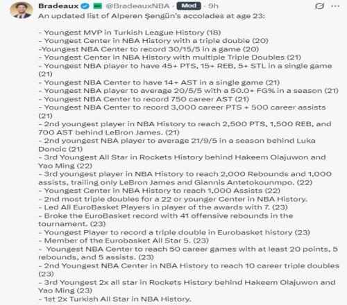 火箭記者Bradeaux曬出23歲的阿爾佩倫-申京所獲得的榮譽清單: