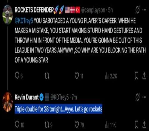 對陣黃蜂一戰(zhàn),杜蘭特曾炮轟申京該努力防守,這讓很多火箭球迷炮轟杜蘭特認(rèn)為KD影響了申京的成長,一位球迷寫道:你毀掉了一位年輕球員的職業(yè)生涯。他犯錯時,你便做出愚蠢的手勢,還把他推到媒體面前。反正你兩年后就會被聯(lián)盟淘汰,何必阻礙一位新星的成長之路?