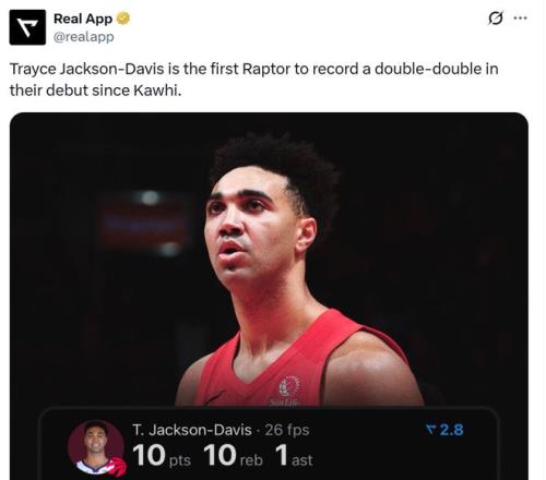 憑借這樣的表現,TJD成為猛龍隊史第5位加盟首秀就能拿下兩雙的新援,也是小卡之后首人。