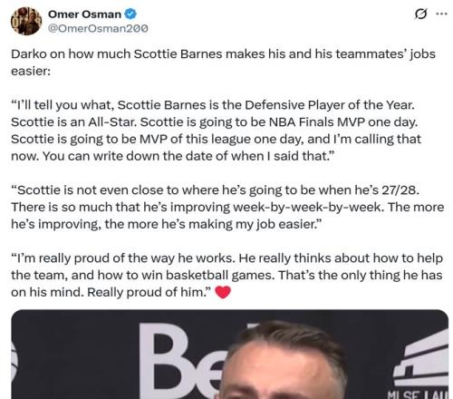 面對巴恩斯這樣的表現,猛龍隊主帥拉賈科維奇猛夸到:“我跟你說,巴恩斯是年度最佳防守球員,他是全明星球員,總有一天他會成為FMVP,也會成為這個聯盟的MVP,你們可以記下我說這番話的日期。”