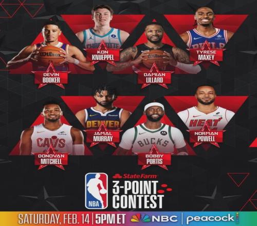 近日NBA官宣全明星三分大賽參加名單,分別有布克(太陽)、克尼佩爾(黃蜂)、利拉德(開拓者)、馬克西(費城)、米切爾(騎士)、穆雷(掘金)、波蒂斯(雄鹿),以及鮑威爾(熱火)。