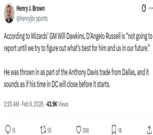 消息來自于奇才總經理威爾-道金斯,他在采訪中公開表示:“拉塞爾不會來報到,我們已經與他的經紀人聊過,正在努力尋找對于我們彼此均有利的雙贏方案。”