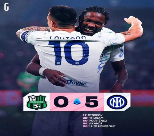 今天凌晨,國米在意甲第24輪客場挑戰薩索洛。上半場,比塞克頭球首開紀錄,小圖拉姆擴大比分,國米2:0領先。下半場,勞塔羅和阿坎吉3分鐘內頭頂腳踢將比分擴大到4:0,恩里克在終場前抽射破門,最終國米客場取得5:0大勝!