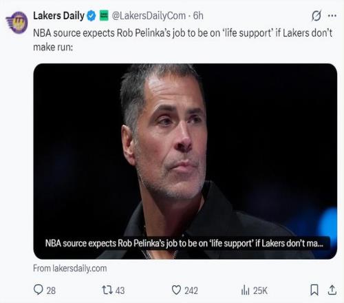 北京時間2月10日,根據湖人媒體Laker Daily的報道,湖人GM佩林卡已經進入下課倒計時。除非湖人在下半個賽季有所突破,或者在季后賽中有所作為,如果球隊還是勉強維持現狀,那么佩林卡很難跨過這一關了。