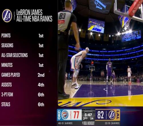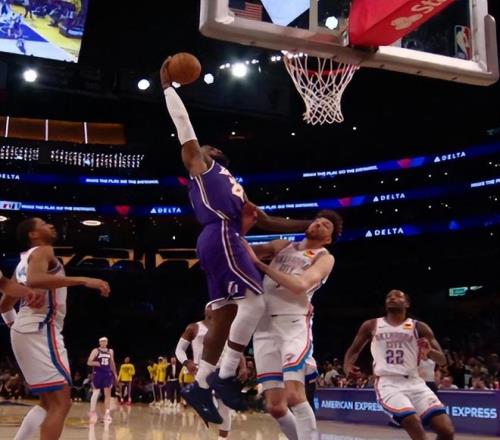 易邊再戰,湖人打出了一波23-10的攻防浪潮,半節只讓雷霆拿10分湖人的防守一下就提升了,引來湖人防守變化的人就是勒布朗,他身先士卒連續在防守端完成協防,而且詹姆斯連續的突破漲分湖人一度拉開到8分,但詹姆斯被換下場的3分鐘湖人再度崩盤,單節詹姆斯10分3助攻2籃板1搶斷,湖人依舊落后雷霆進入末節。