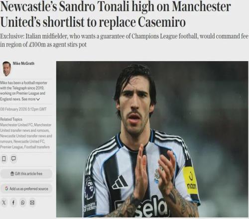 托納利目前的合同2029年到期,因此意大利人的價格會很高,據悉紐卡對他的要價將在1億英鎊,并且他們希望留住這名中場。
