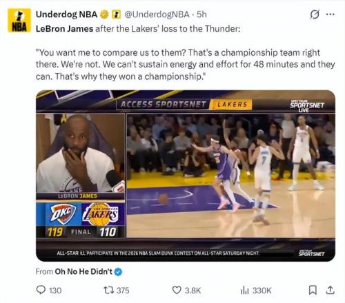 勒布朗-詹姆斯在賽后直言與雷霆的差距很大,他表示,雷霆是總冠軍級別的球隊而湖人不是,湖人的防守效率聯盟第一,從各種數據來看雷霆都是頂尖球隊,他們給持球者施加了很多壓力,他們有華萊士、卡魯索、杰威那樣的頂級防守球員,我們已經嘗試按照計劃去執行,但他們的防守可以讓我們遠離我們喜歡的得分區域。
