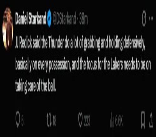 湖人110-119不敵雷霆,這場比賽湖人輸的非常憋屈,雷迪克的兩次挑戰都是非常明顯的誤判,而且在末節多爾特絆倒了里夫斯,但裁判就在邊線卻視而不見,華萊士還有一個明顯界外球裁判也視而不見。