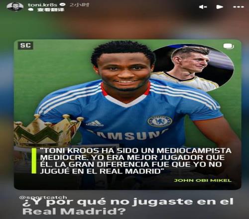 米克爾稱自己比克羅斯更優秀,后者回擊:那你為啥沒去皇馬 懂球帝 2026-02-11 01:18:29 早些時候,米克爾在自己的播客節目中談到了自己對克羅斯的看法,他表示,自己比克羅斯更優秀,只是沒有去皇馬,隨后,克羅斯本人在社交媒體上進行了回應。在播客節目中,米克爾表示:“克羅斯一直是個平庸的中場球員,我比他更優秀,最大的區別只是我沒能為皇馬效力。”隨后,克羅斯在社交媒體上轉發了有關的報道,并配文:“那你為什么沒去皇馬呢?”【上咪咕獨家看英超】西甲免費觀看_英超免費觀看_皇馬免費觀看_西甲高清在線_英超高清在線_皇馬高清在線 西甲 英超 皇馬 比克羅斯 皇家馬德里 托尼·克羅斯 世界足球先生 約翰·奧比·米克爾 米基爾·約翰·奧比 上一篇: 不像是職業教練熱刺排名第14戰績一瀉千里,弗蘭克被球迷狂噴 下一篇: 郵報:澳波在挪威一大學開展戰術研討會,有約250人參加