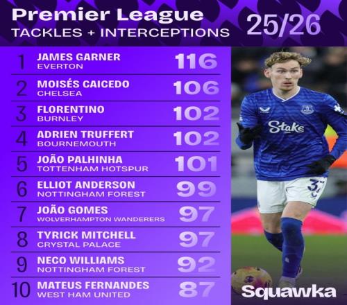 此外,內(nèi)科·威廉姆斯(諾丁漢森林)以92次位列第九,馬特烏斯·費(fèi)爾南德斯(西漢姆聯(lián))以87次居于第十名。這份統(tǒng)計(jì)不僅反映了這些球員在防守端的重要作用,也顯示出他們?cè)诒荣愔袨榍蜿?duì)付出的努力。