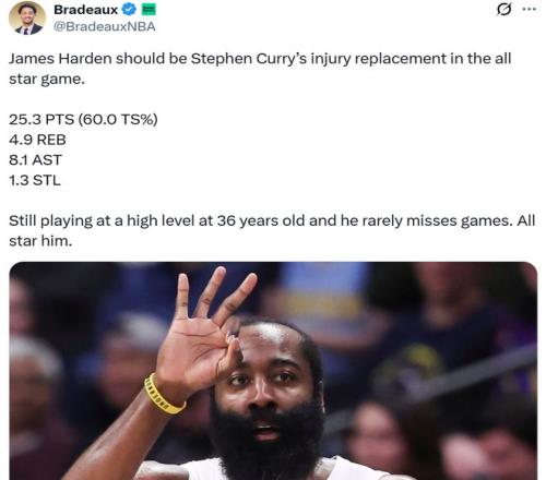 火箭媒體人Bradeaux也呼吁聯盟挑選哈登入選,并且給出兩大原因,第一點是36歲的哈登依舊保持著頂級比賽影響力,場均拿下25.3分4.9板8.1助1.3搶斷,真實命中率60%,第二點是哈登幾乎不缺席比賽,理應入選全明星。