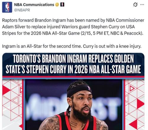 最終NBA官方宣布,總裁蕭華指定英格拉姆入選全明星,替代因膝傷缺席全明星的庫里,代表美國隊參賽。