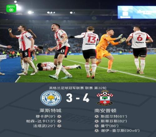 北京時間2月11日,英格蘭足球冠軍聯賽第32輪,萊斯特城主場對陣南安普頓。比賽中,萊斯特城憑借穆卡薩、帕森-達卡和法塔武的進球取得3-0領先。此后場上風云突變,南安普頓依靠斯圖爾特、斯蒂芬斯、曼寧和謝伊-查爾斯的進球讓三追四神奇逆轉。最終,南安普頓4-3萊斯特城。