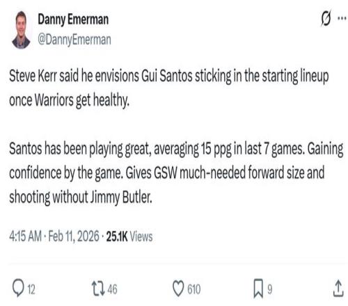 隊記Danny Emerman曝出,勇士主帥科爾公開表示哪怕球隊恢復健康,自己也會讓桑托斯繼續(xù)留在首發(fā)陣容。