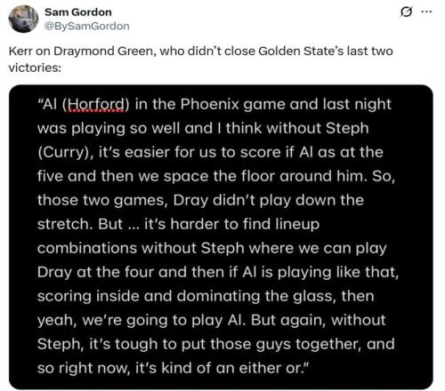 科爾表示主要原因是庫里缺陣,讓自己不得不在霍福德與追夢之間二選一,因為庫里缺席后球隊迫切需要霍福德拉開空間,所以選擇連續(xù)末節(jié)DNP追夢。