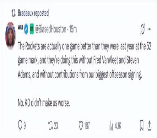 外界對37歲的杜蘭特誤解太多,實際上他場均36.7分鐘聯盟第三,他場均25.9分也是火箭得分最高,命中率51%、三分命中率40.4%,罰球命中率87.8%,他進攻效率120.5聯盟第31,這樣的杜蘭特怎么會讓火箭變得更糟?
