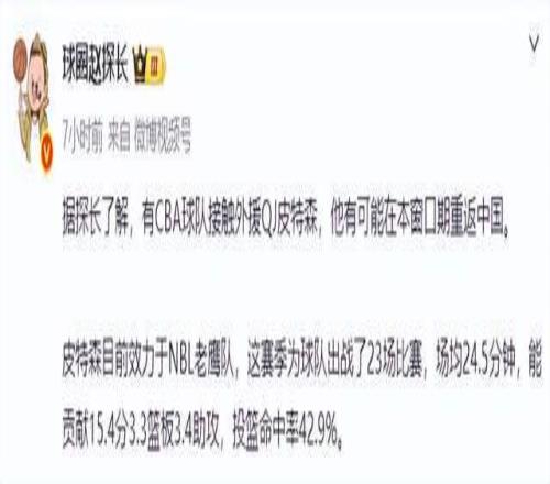 第一階段常規(guī)賽打完之后,不少CBA俱樂(lè)部都在積極補(bǔ)強(qiáng)外援陣容,很多球隊(duì)都把引援方向投向了澳洲NBL聯(lián)賽。據(jù)媒體人“球圈趙探長(zhǎng)”最新報(bào)道:“有CBA球隊(duì)接觸外援皮特森,他有可能在本窗口期重返中國(guó)。”隨后就有媒體人透露消息,目前是北控男籃和山東男籃在追逐,但是皮特森接近加盟北控男籃。北控男籃第一階段的成績(jī)并不理想,僅僅取得11勝12負(fù)聯(lián)盟第十一名的成績(jī),外援陣容中只有里勒能夠真正挑起大梁,在裁掉外援基茲林克之后,北控男籃也急需補(bǔ)強(qiáng)外援陣容。