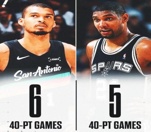 最終文班轟下40分也追平個(gè)人賽季得分紀(jì)錄,并且是其生涯第6次砍下40+得分,在比鄧肯少打1236場(chǎng)的情況下,40+場(chǎng)次已經(jīng)超越鄧肯,追平吉諾比利升至隊(duì)史第4。